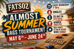 Searching for a bags tournament near you or a fun Wednesday night event in Elgin, IL? Join the Almost Summer Bags Tournament at Fatsoz Bar & Grill, running weekly from May 6th through June 24th, 7–9 PM.